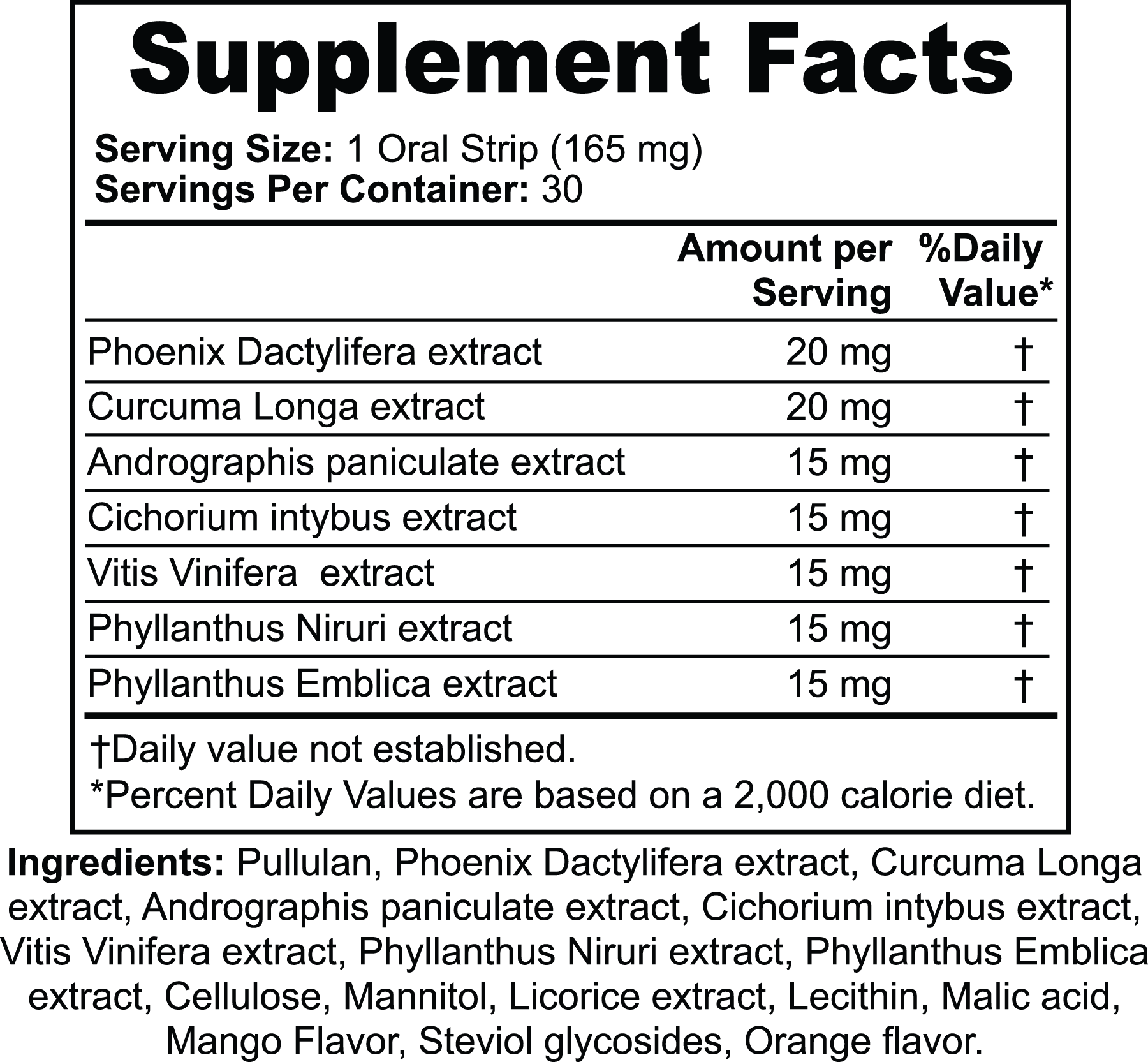 Ingredients: Pullulan, Pheonix Dactylifera extract, Curcuma Longa extract, Andrographis paniculate extract, Cichorium intybus extract, Vitis Vinifera extract, Phyllanthus Niruri extract, Phyllanthus Emblica extract, CEllulose, Mannitol, Licorice extract, Lecithin, Malic acid, Mango Flavor, Steviol glycosides, Orange flavor